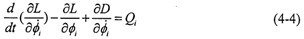 對(duì)轉(zhuǎn)換成鏈狀結(jié)構(gòu)的系統(tǒng),應(yīng)用拉格朗日法建立系統(tǒng)的扭振動(dòng)力學(xué)方程,系統(tǒng)中帶有粘性阻尼,因此列出含有耗散函數(shù)的拉格朗日方程