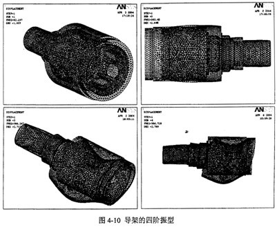 選擇Subspace特征值求解器,指定擴(kuò)展模態(tài)數(shù)為4,頻率范圍為0~1000Hz。求得輸入軸的前四階固有頻率為101.SHz、207.2Hz、660.6Hz、661.2Hz,對(duì)應(yīng)的振型見(jiàn)圖4-8。一階振型為繞z軸扭轉(zhuǎn),二階振型為沿z軸軸向拉伸,三階振型為在xoz平面彎曲,四階振型為在yoz平面彎曲。