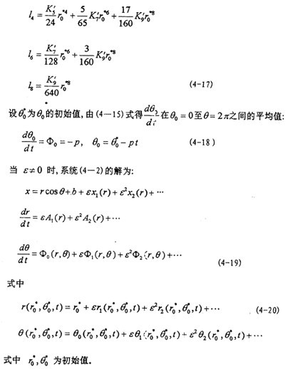 在非線性振動系統(tǒng)中,當系統(tǒng)受到周期性外力作用的情況下,有可能產(chǎn)生三類運動,非共振運動,共振運動,由非共振運動到共振運動的過渡過程,即瞬態(tài)運動。對于共振運動來說,有三類,(l)m=n,即ω=p,這是通常所說的共振,稱為主共振,(2)n=1,ω=mp,產(chǎn)生泛音共振,當m為奇數(shù)時,產(chǎn)生次諧波共振,(3)m=1,ω=p/n,當n為奇數(shù)時,產(chǎn)生超諧波共振。將幕級數(shù)形式的dθ0/dt代人(4-40),并計算該式在O-2區(qū)間的定積分,可以得出結(jié)論:只有當n=1,m=±1,±3,±5,±7,……時才可能得到(4-2)的周期解,并且(4-2)式只可能產(chǎn)生主共振解和次諧波共振解。