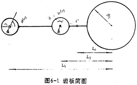齒板簡(jiǎn)圖如圖6-1所示。以齒板支承軸孔與偏心套的接觸點(diǎn)為參考點(diǎn),則齒板質(zhì)心的位移為