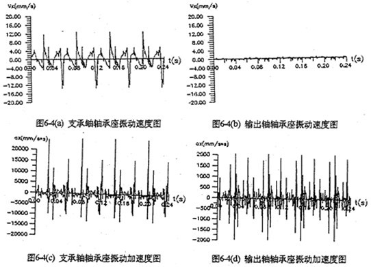 輸出軸軸顧座的振動(dòng)速度及加速度都比支承軸或輸入軸軸承座的小10倍左右,其最大值為