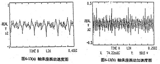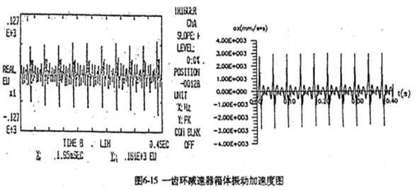 由于每片齒板都存在同樣的周期性激勵(lì)沖擊函數(shù),相位差120°,迭加后的總效果仍然是轉(zhuǎn)頻周期函數(shù)。因此對(duì)箱體軸承座的沖擊也呈周期性。圖6-13是支承軸箱體軸承座的振動(dòng)速度及加速度的實(shí)測(cè)時(shí)域曲線圖。其曲線圖的變化規(guī)律及幅值與圖6-4完全接近。速度及速度沖擊值為