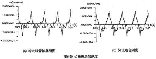 增大行星軸承剛度的目的在于減小雙曲柄機(jī)構(gòu)的變形,降低死點(diǎn)沖擊幅值。并且使各相嚙合力均衡化、減小嚙合沖擊。圖6-20是分別將行星軸承剛度增加一個(gè)數(shù)量級(jí)和內(nèi)齒圈降低一個(gè)數(shù)量級(jí)時(shí)齒板的振動(dòng)加速度。兩者加速度幅值均降低了1/4 倍左右。