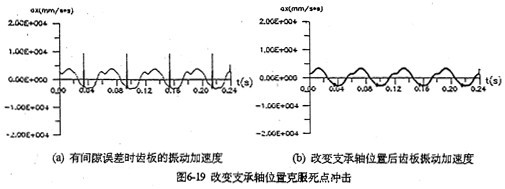 采用雙軸輸人的齒板及箱體軸承座振動(dòng)速度、加速度如圖6-17所示。從圖看出齒板速度及加速度值明顯變小(為單軸輸人時(shí)的0.3倍),而且無(wú)沖擊,完全屬于穩(wěn)太振動(dòng)。箱體的振動(dòng)速度及加速度幅值只是單軸輸人時(shí)的0.2倍。圖6-18a是一軸的偏心套存在0.05度的分度誤差時(shí)齒板的加速度曲線圖,圖中明顯出現(xiàn)加速度沖擊棒線。采用雙軸輸入后,死點(diǎn)沖擊被徹底(見(jiàn)圖6-18b) , 變成穩(wěn)態(tài)振動(dòng)曲線了。因此,為了減小三環(huán)減速器的振動(dòng),有必要加大三環(huán)減速器的橫向尺寸,在箱體內(nèi)增加一套雙軸輸入的齒輪功率分流機(jī)構(gòu),或者在箱體外另設(shè)計(jì)一套功率分流機(jī)構(gòu),以解決機(jī)構(gòu)過(guò)死點(diǎn)的振動(dòng)問(wèn)題。
