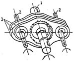 三環(huán)減速器是一種利用三相并列雙曲柄機構(gòu)來克服死點的連桿內(nèi)齒行星齒輪減速器,其基本結(jié)構(gòu)如圖5-0所示。它由低速輸出軸1 ,兩根高速輸入軸2 ,三片傳動齒板3組成,各軸均平行配置,相同的兩根高速軸帶動三片傳動齒板呈120°相位差作平面轉(zhuǎn)動,傳動環(huán)板上的內(nèi)齒圈與低速軸上的外齒輪相嚙合,形成大速比,其傳動比