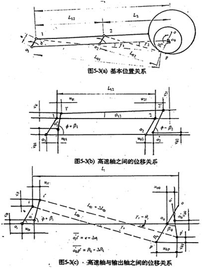 三環(huán)減速是多相并列連桿行星齒輪傳動過約束機構(gòu)。應(yīng)該從整體系統(tǒng)上去考慮其變形關(guān)系。圖5-3是一相子機構(gòu)的位移關(guān)系圖。圖5-3(a)是基本位置圖、圖5-3(b)是高速軸之間的位移關(guān)系、圖5-3(c)是高速軸與輸出軸之間的位移關(guān)系(i=1、2)。由圖寫出各運動副中心的位移關(guān)系如下: