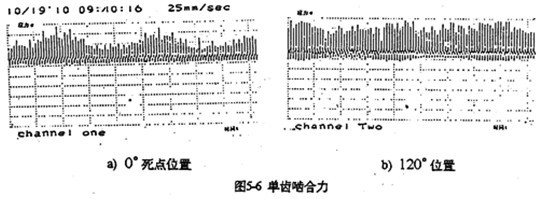 理想情況下,嚙合力的極小值在φ=0°、180°產(chǎn)生,極大值在φ=90°、270°產(chǎn)生,造成位置偏離的影響因素主要有軸承剛度,齒板剛度,嚙合角以及輸入轉(zhuǎn)速、傳動比等等。其中軸承剛度的影響極大。在死點的嚙合力也產(chǎn)不并一定為零。哈合力可能為負(fù)值。為負(fù)值時,將阻礙傳動的正常轉(zhuǎn)動,產(chǎn)生內(nèi)齒輪副的干涉現(xiàn)象。并引起減速器沖擊振動。因此,按照嚙合力過死點時為零的假設(shè)分布規(guī)律以及嚙合力為常數(shù)分布規(guī)律的模型分析,所得結(jié)果都是不可靠的。圖5-6是齒板死點位置180°及另一齒板位于超前120°嚙合點的單齒嚙合圖的測試結(jié)果。圖中每一棒線代表被測齒受嚙合力作用一次。比較兩圖可知,死點位置嚙合力總體水平低于120°位置時的嚙合力總體水平,與理論分析計算的結(jié)果完全吻合。