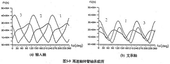 4.輸出軸的行星軸承總體載荷比支承軸行星軸承總體載荷大(圖5-9),特別是輸入軸X方向受力最大。輸入軸行星軸承載荷在死點附近取得最小值,在φ=105°、255°取得極大值。極大值產(chǎn)生的位置正好是機構(gòu)傳動角最佳位置附近。在同一時刻,齒板上各輸入軸行星軸承的受力狀況是不是一樣的。當(dāng)某一齒板接近其死點位置時,軸承載荷較小,而同時另外兩片遠離死點位置的齒板上輸入軸行星軸承載荷要大得多。支承軸的軸承載荷在一個周期內(nèi)分別出現(xiàn)三次極大值和三次極小的值。由于這個原因使支承軸偏心套的微動磨損比輸入軸偏心套的微動磨損更為嚴(yán)重。行星軸承載荷的最大值為