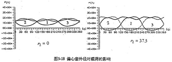 圖5-18是偏心套外徑對嚙合圖的影響。當(dāng)不考慮偏心套外徑(r2=0)時,嚙合力分布為正值?紤]偏心套外徑(r2=37.5mm)計算結(jié)果,出現(xiàn)負(fù)向嚙合力。而且其幅值明顯增大。輸入扭矩也不再是固定值。因此,對三環(huán)減速器進行動力計算,必須考慮r2的影響。此外,行星軸承內(nèi)外圈接觸承載位置,也影響三環(huán)減速器的動力性能。
