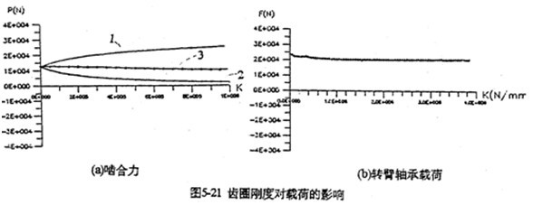 只考慮行星軸承變形及齒板變形時,影響三環(huán)減速器載荷特性的剛度,主要是行星軸承剛度、和內(nèi)齒圈的變形剛度。軸承剛度與軸承材料、間隙、油膜等很多因素有關(guān)。圖5-19是輸入軸行星軸承剛度對嚙合力及行星軸承載荷的影響。當(dāng)輸入行星軸承剛度小一個數(shù)量級時,負(fù)向嚙合力區(qū)域增大(見圖5-19a);隨剛度減小、各相嚙合力越不均恒(圖5-19b),輸入軸行星軸承剛度的影響比輸入軸行星軸承剛度更大,見圖5-20所示。嚙合力及各行星軸承載荷在軸承剛度較小的情況時,都出現(xiàn)正常載荷的10倍以上的沖擊現(xiàn)象,沖擊產(chǎn)生的位置隨剛度變化不同。內(nèi)齒圈剛度對載荷的影響與行星軸承剛度相反(見圖5-21所錄)。當(dāng)剛度越小時,三相齒板的嚙合力越均恒(見圖5-21a),而且行星軸承載荷幅值基本上不變(見圖5-21b)。同此可推知,減小三環(huán)減速器振動的途徑之一就是提高行星軸承剛度,減小內(nèi)齒圈剛度。這可以通過對行星軸承進行預(yù)緊,和采用軟齒面或大柔度齒圈的辦法,以使嚙合力和行星軸承載荷均衡化,以達到減振降噪的目的。