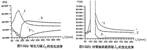 各軸水平布置時,軸間的中心距變化,將引起各載荷大小幅值、規(guī)律均發(fā)生變化。圖5-22是輸入軸相對輸出軸位置變化時,減速器的嚙合力及軸承載荷變化情況。由圖可知,當(dāng)輸入軸與支承軸中心距(L2=200mm)很小時,三齒板的嚙合力分配很不均衡,隨著L1的增加嚙合力趨于均衡(見圖5-22a)。行星軸承載荷變化情況見圖5-22b所示。