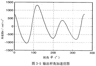 首先由圖3-2可以看到,若機(jī)構(gòu)結(jié)構(gòu)參數(shù)設(shè)計(jì)恰當(dāng),并且調(diào)整中間滑塊3偏移到合適的位置時,可在一定范圍內(nèi),產(chǎn)生一個反向的速度波適度抵消原速度波動。再由圖3-3可知,在未加入第二自由度時,加速度變化值不大,說明阻力矩和電機(jī)主動力矩不會受到大的影響,不致導(dǎo)致原機(jī)械系統(tǒng)的各項(xiàng)參數(shù)發(fā)生大的變化。