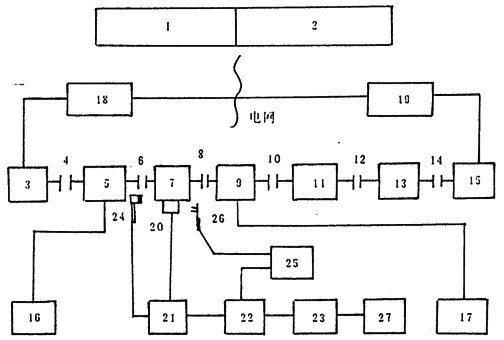 試驗(yàn)時(shí),通過控制臺1,2調(diào)節(jié)控制系統(tǒng)讓交直流機(jī)組18發(fā)出適當(dāng)?shù)闹绷麟妷菏怪绷鳒y功機(jī)3(工作于恒速電動(dòng)工況)按恒定轉(zhuǎn)速轉(zhuǎn)動(dòng),通過聯(lián)軸器4,6和輸入轉(zhuǎn)速扭矩傳感器5與試件7輸放端(高速端)相聯(lián)接。試件7輸出端通過聯(lián)軸器8,10,12,14及輸出扭矩傳感受器9、升速用11、汽車變速箱13而與直流測功機(jī)15(工作于恒電流工況)聯(lián)接,驅(qū)使其發(fā)出適當(dāng)電壓的直流電,再通過交直流機(jī)組19將其逆變成為工頻北流電返回電網(wǎng),完成整個(gè)電功率封閉閉鏈。