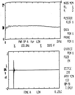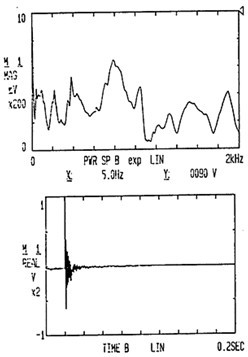 試件7上的振動(dòng)信號與脈沖激勵(lì)的響應(yīng)信號通過傳感器20取出信號,然后經(jīng)過放大器21放大后,用磁帶記錄儀22記錄并可采用頻譜分析儀23監(jiān)控并分析,而其上的噪聲信號可以通過聲強(qiáng)儀25的測頭26取出信號后送入22和23中用于分析研究。