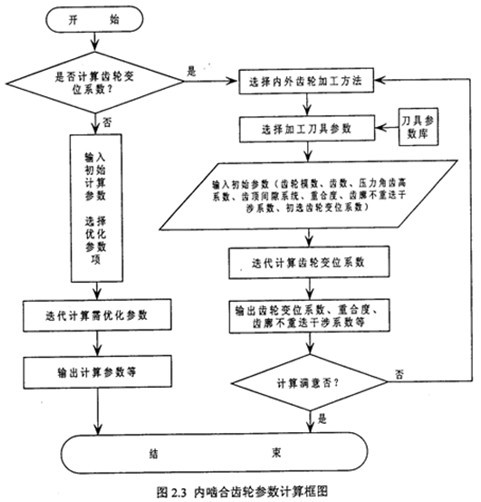 在少齒差內(nèi)嚙合傳動(dòng)中,變位系數(shù)的確定是設(shè)計(jì)的關(guān)鍵。齒輪的實(shí)際幾何尺寸與齒輪的加工方法有直接的關(guān)系,所以用不同的齒輪加工方法的計(jì)算公式來推導(dǎo)變位系數(shù)的迭代公式,所得迭代結(jié)果不一樣。內(nèi)嚙合齒輪參數(shù)計(jì)算模塊中,已經(jīng)由公式(2.5 )~(2.9 )推導(dǎo)了少齒差內(nèi)嚙合傳動(dòng)的各種實(shí)際加工情況下的變位系數(shù)的計(jì)算迭代公式,圖(2.3)為齒輪變位系數(shù)計(jì)算框圖。
