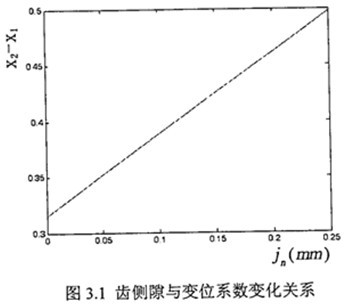 本文實驗樣機的環(huán)板齒輪設(shè)計參數(shù)見表3.1所示,根據(jù)本文實驗樣機的環(huán)板齒輪設(shè)計參數(shù),假定嚙合角不變化,則對應(yīng)齒側(cè)隙的變化,應(yīng)用MATLAB繪圖分析,得到了齒輪變位系數(shù)隨齒側(cè)隙變化時的變化規(guī)律圖,見圖3.1所示。