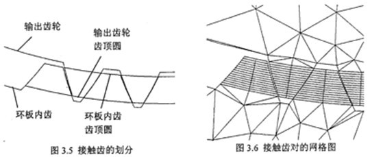 因為在少齒差內(nèi)嚙合中,不處于嚙合位置的齒對在進入嚙合之前以及在脫離嚙合之后,其內(nèi)、外齒廓間的間隙非常小,因此雙環(huán)減速器環(huán)板內(nèi)齒輪嚙合傳動在載荷作用下,因彈性變形實際接觸齒對數(shù)遠(yuǎn)大于理論重合度,在傳遞載荷的過程中,輪齒的變形量要大于一部分齒對的間隙,這些齒對就要接觸并同時分擔(dān)載荷,這就大大提高了整個齒輪傳動裝置的承載能力。同時實際齒輪的接觸對數(shù)及接觸應(yīng)力,隨著載荷增大而相應(yīng)增加。因而少齒差內(nèi)嚙合行星齒輪傳動的實際接觸齒對數(shù)的確定,對齒輪承載能力的估算以及齒輪模數(shù)的正確確定具有重要意義。對于齒輪的接觸問題的,國內(nèi)外學(xué)者對此已作了不少研究,取得一些研究成果。然而這些研究有的沒有考慮誤差的影響,有的僅考慮內(nèi)外嚙合齒輪副齒廓理論間隙,沒有考慮輪齒制造誤差和輪齒的彈性變形的影響。本文對于環(huán)板內(nèi)齒輪接觸問題進行了計算,計算時考慮內(nèi)外嚙合齒輪副齒廓理論間隙、制造誤差及輪齒彈性變形的影響,在此基礎(chǔ)上,建立了少齒差內(nèi)嚙合行星齒輪傳動實際接觸齒對數(shù)及各齒間載荷分配的理論分析計算的實體模型,利用I-DEAS軟件進行了環(huán)板內(nèi)齒輪接觸有限元計算,并用該軟件分析計算了在不同載荷工況下的實際接觸齒對數(shù)、最大接觸應(yīng)力以及兩環(huán)板上各接觸齒的載荷分配情況。