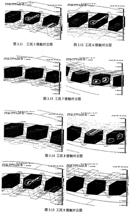 按考慮偏心距誤差影響及考慮齒厚誤差影響的兩個極限狀態(tài),組合為十種情況進行計算。十種計算工況見表3.2所示?紤]齒厚誤差影響的兩個極限狀態(tài)分別是齒輪的輪齒最薄、最厚,偏心距誤差的兩個極限狀態(tài)分別是偏心軸的偏心距最大、最小兩種情況。種接觸情況的計算結(jié)果分別由表3.3~3.7列出。