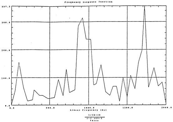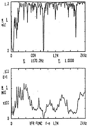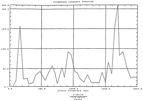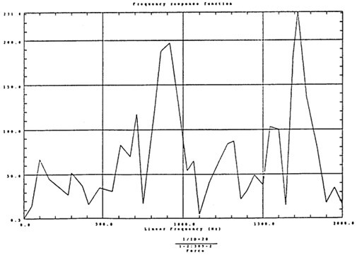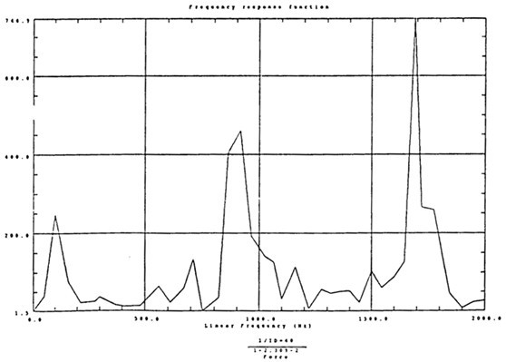 有了脈沖激勵信號和脈沖響應信號后,CF-355頻譜分析儀就能計算出測點12X向由于14點X向激勵間的頻響函數(shù)H(ω)及其相干函數(shù),如圖4-5所示。圖4-6是頻響函數(shù)H(ω)的倒數(shù)。