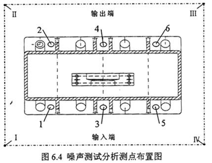 結(jié)構(gòu)振動(dòng)噪聲測(cè)試在齒輪箱安裝基腳布置6個(gè)測(cè)點(diǎn),測(cè)點(diǎn)布置圖見(jiàn)圖3中1-6測(cè)點(diǎn),在每一測(cè)點(diǎn)上按31.5Hz~5kHz1/3倍頻中心頻率測(cè)試加速度級(jí)頻譜(re:a0=10-6m/s)和1/3倍頻中心頻率測(cè)試速度級(jí)頻譜(re:a0=5*10-8m/s)。空氣噪聲測(cè)試聲壓級(jí)基準(zhǔn)2*10-5Pa,用聲級(jí)計(jì)上的A計(jì)權(quán)聲壓級(jí)和1/1倍頻程聲壓級(jí)測(cè)量減速齒輪裝置各個(gè)測(cè)點(diǎn)。各測(cè)點(diǎn)距齒箱測(cè)量表面的距離為1米。測(cè)點(diǎn)位置見(jiàn)測(cè)點(diǎn)布置圖6.4中Ⅰ-Ⅳ測(cè)點(diǎn)。