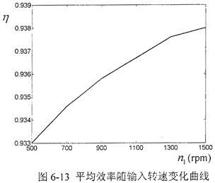 進行減速器效率試驗前,首先讓減速器在輸入轉速為500rpm的條件下,空載跑合4個小時,觀察運轉正常后,進入試驗的準備階段。為測得準確試驗數(shù)據(jù)必項對轉矩轉速測量儀進行常數(shù)輸入和轉矩調零設置,一切準備完畢后,開始對減速器進行試驗測試。當輸入軸轉速取不同值時計算出減速器樣機的傳動比及樣機總評傳動比如表6-1所示,通過分析測試數(shù)據(jù)可知,經(jīng)實測最大的傳動比誤差為-0.0148,平均傳動比誤差為-0.0078。表明樣機的傳動比準確,傳動精度高。經(jīng)分析可知,正弦滾道的加工精度是造成整機傳動誤差的主要原因。