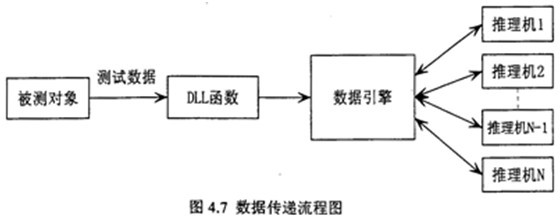 根據(jù)流程圖可知,從故障測(cè)試數(shù)據(jù)到數(shù)據(jù)引擎,有兩種數(shù)據(jù)處理方式,一種是故障測(cè)試數(shù)據(jù)由數(shù)據(jù)采集系統(tǒng)采集后,可先進(jìn)行預(yù)處理,將故障信號(hào)數(shù)據(jù)處理為推理機(jī)所需的故障特征數(shù)據(jù),然后發(fā)送出去,動(dòng)態(tài)連接庫(kù)DLL函數(shù)則通過網(wǎng)絡(luò)接收這些故障特征數(shù)據(jù),同時(shí)對(duì)照推理機(jī)向數(shù)據(jù)引擎申請(qǐng)的故障特征變量,將申請(qǐng)的故障特征變量對(duì)應(yīng)的值找出,按數(shù)據(jù)引擎規(guī)定的格式反送給申請(qǐng)數(shù)據(jù)的推理機(jī)。另一種是故障測(cè)試數(shù)據(jù)由數(shù)據(jù)采集系統(tǒng)采集后,按一定格式直接發(fā)送出去,動(dòng)態(tài)連接庫(kù)DLL函數(shù)則通過網(wǎng)絡(luò)接收這些故障信息數(shù)據(jù),然后再進(jìn)行數(shù)據(jù)預(yù)處理,將故障信息數(shù)據(jù)處理為推理機(jī)所需的故障特征數(shù)據(jù),同時(shí)對(duì)照推理機(jī)向數(shù)據(jù)引擎申請(qǐng)的故障特征變量,將申請(qǐng)的故障特征變量對(duì)應(yīng)的值找出,再按數(shù)據(jù)引擎規(guī)定的格式反送給申請(qǐng)數(shù)據(jù)的推理機(jī)。