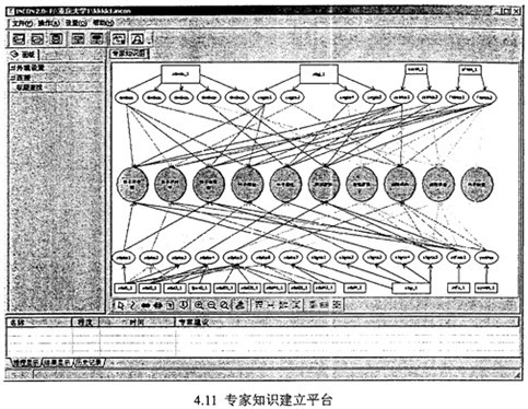 專家知識(shí)輸入引擎模塊內(nèi)容如圖4.3所示,該模塊的核心是用圖形化的方式建立診斷推理流程圖,該流程圖是由分布三個(gè)層次上的多個(gè)節(jié)點(diǎn)及節(jié)點(diǎn)間的連線所組成,如圖4.4。診斷推理流程圖中,底層為“數(shù)據(jù)”層,這里的數(shù)據(jù),可以是測(cè)量參數(shù)、傳感器的輸出、工作狀態(tài)、檢修記錄等多種廣泛意義上的參數(shù),中間層為“故障現(xiàn)象”層,這里的癥狀現(xiàn)象可以是能直接觀察到的現(xiàn)象(如工作條件、參數(shù)范圍、參數(shù)變化等),也可以是間接的現(xiàn)象,即多種廣泛意義上的現(xiàn)象。最上層為“故障原因”層。用連線相連彼此相關(guān)的“數(shù)據(jù)”與“故障現(xiàn)象”或“故障現(xiàn)象”與“故障原因”。這樣構(gòu)成診斷推理流程圖。
