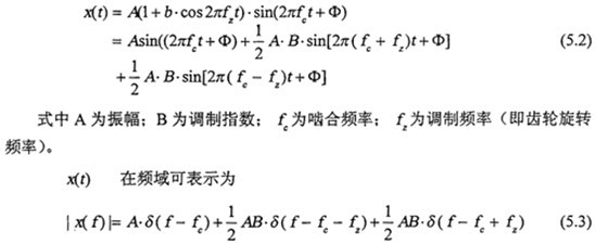 調制后的信號,除原來的嚙合頻率分量外,增加了一對分量(fc+ fn)和(fc-fn)它們以fc為中心,以fz為間距對稱分布于fc兩側,所以稱為邊頻帶,見圖5.1所示。上述原理不但適用于像齒輪偏心的故障,也適用于可產生沖擊信號的其它故障,如崩齒、齒面剝落等。