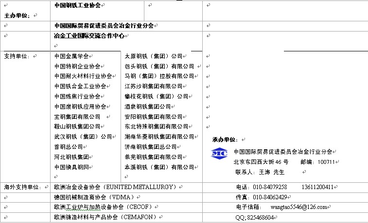 5.向中國大陸、港澳臺地區(qū)以及東亞、東南亞地區(qū)國家的冶金企業(yè)、相關(guān)企業(yè)以及貿(mào)易公司寄送展覽會參觀券。同時通過當(dāng)?shù)貐f(xié)會或代理,向印度、俄羅斯、中東地區(qū)及歐美等地區(qū)寄送參觀券。