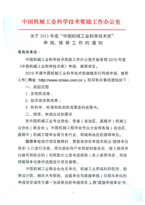 關(guān)于2015年度“中國(guó)機(jī)械工業(yè)科學(xué)技術(shù)獎(jiǎng)”申報(bào)、推薦工作的通知