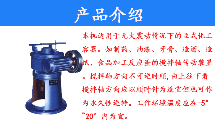 本機(jī)適用于無大震動(dòng)情況下的立式化工容器。如制藥、油漆、牙膏、造酒、造紙、食品加工反應(yīng)釜的攪拌軸傳動(dòng)裝置。攪拌軸方向不可逆時(shí)順,由上往下看攪拌軸方向應(yīng)以順時(shí)針為適宜但也可作為永久性逆轉(zhuǎn)。工作環(huán)境溫度應(yīng)在-5°~20°內(nèi)為宜。
