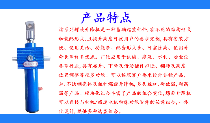 該系列螺旋升降機(jī)是一種基礎(chǔ)起重部件,有不同的結(jié)構(gòu)形式和裝配形式,且提升高度可按用戶的要求定制,具有安裝方便、使用靈活、功能多、配套形式多、可靠性高、使用壽命長(zhǎng)等許多優(yōu)點(diǎn)。廣泛應(yīng)用于機(jī)械、建筑、水利、冶金設(shè)備等行業(yè),具有起升、下降及借助輔件推進(jìn)、翻轉(zhuǎn)及高度位置調(diào)整等很多功能。可以按照客戶要求設(shè)計(jì)非標(biāo)產(chǎn)品,如:不銹鋼殼體及絲杠螺旋升降機(jī),多頭絲杠,耐低溫,耐高溫等產(chǎn)品。模塊化組合豐富了產(chǎn)品的組合變化,螺旋升降機(jī)可以直接與電機(jī)/減速電機(jī)特殊功能附件的任意組合,一體化設(shè)計(jì),提供多種選型組合