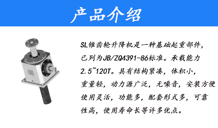 SL錐齒輪升降機(jī)是一種基礎(chǔ)起重部件,已列為JBZQ4391-86標(biāo)準(zhǔn)。承載能力2.5~120T。具有結(jié)構(gòu)緊湊、體積小、重量輕、動(dòng)力源廣泛、無(wú)噪音、安裝方便、使用靈活、功能多、配套形式多,可靠性高、使用壽命長(zhǎng)等許多優(yōu)點(diǎn)。