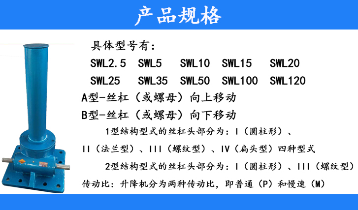 承載能力2.5—120T。具有結(jié)構(gòu)緊湊、積小、重量輕、動(dòng)力源廣泛、無(wú)噪音、安裝方便、使用靈活、功能多、配套形式多、可靠性高、使用壽命長(zhǎng)許多優(yōu)點(diǎn)。具有提升、降落、推進(jìn)、翻轉(zhuǎn)等多種功能,可以單臺(tái)或組合使用,能按一定程序準(zhǔn)確地控制調(diào)整升或推進(jìn)的高度,可以用電動(dòng)機(jī)或其它動(dòng)力直接帶動(dòng),也可以手動(dòng)。最高輸入轉(zhuǎn)速1500r/min,最大提升速2.7m/min。有不同的結(jié)構(gòu)型式和裝配方式,提升高度按用戶(hù)的要求制造。該裝置可以自鎖。