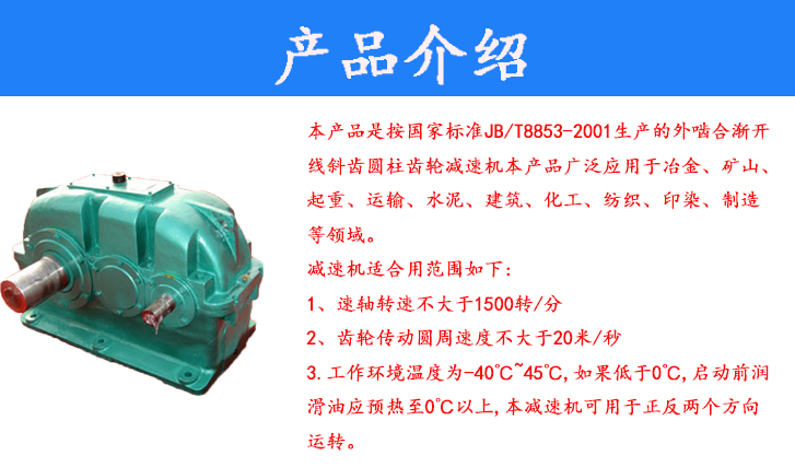 本產(chǎn)品是按國(guó)家標(biāo)準(zhǔn)JB/T8853-2001生產(chǎn)的外嚙合漸開(kāi)線斜齒圓柱齒輪減速機(jī)本產(chǎn)品廣泛應(yīng)用于冶金、礦山、起重、運(yùn)輸、水泥、建筑、化工、紡織、印染、制造等領(lǐng)域。減速機(jī)適合用范圍如下:1,速軸轉(zhuǎn)速不大于1500轉(zhuǎn)/分2齒輪傳動(dòng)圓周速度不大于20米/秒。3.工作環(huán)境溫度為-40℃~45℃,如果低于0℃,啟動(dòng)前潤(rùn)滑油應(yīng)預(yù)熱至0℃以上,本減速機(jī)可用于正反兩個(gè)方向運(yùn)轉(zhuǎn)