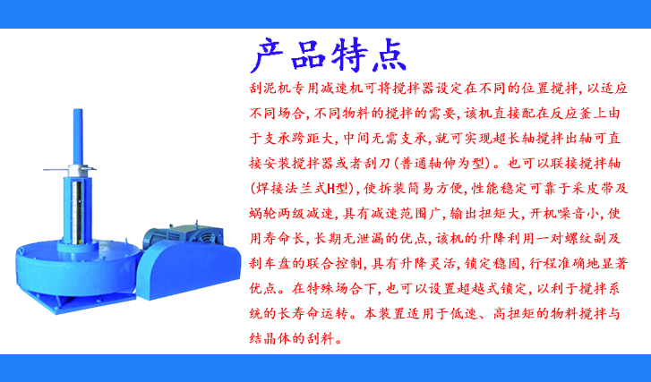 刮泥機(jī)專用減速機(jī)可將攪拌器設(shè)定在不同的位置攪拌,以適應(yīng)不同場合,不同物料的攪拌的需要,該機(jī)直接配在反應(yīng)釜上由于支承跨距大,中間無需支承,就可實(shí)現(xiàn)超長軸攪拌出軸可直接安裝攪拌器或者刮刀(普通軸伸為型)。也可以聯(lián)接攪拌軸(焊接法蘭式H型),使拆裝簡易方便,性能穩(wěn)定可靠于采皮帶及蝸輪兩級(jí)減速,具有減速范圍廣,輸出扭矩大,開機(jī)噪音小,使用壽命長,長期無泄漏的優(yōu)點(diǎn),該機(jī)的升降利用一對螺紋副及剎車盤的聯(lián)合控制,具有升降靈活,鎖定穩(wěn)固,行程準(zhǔn)確地顯著優(yōu)點(diǎn)。在特殊場合下,也可以設(shè)置超越式鎖定,以利于攪拌系統(tǒng)的長壽命運(yùn)轉(zhuǎn)。本裝置適用于低速、高扭矩的物料攪拌與結(jié)晶體的刮料。