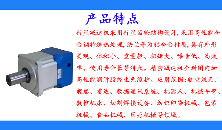 行星減速機(jī)采用行星齒輪結(jié)構(gòu)設(shè)計(jì),采用高性能合金鋼特殊熱處理,法蘭等為鋁合金材質(zhì),具有外形美觀、體積小、重量輕、扭矩大、噪音低、高效率、使用壽命長等特點(diǎn)。精密減速機(jī)全封閉內(nèi)加高性能潤滑脂終生免維護(hù)。
