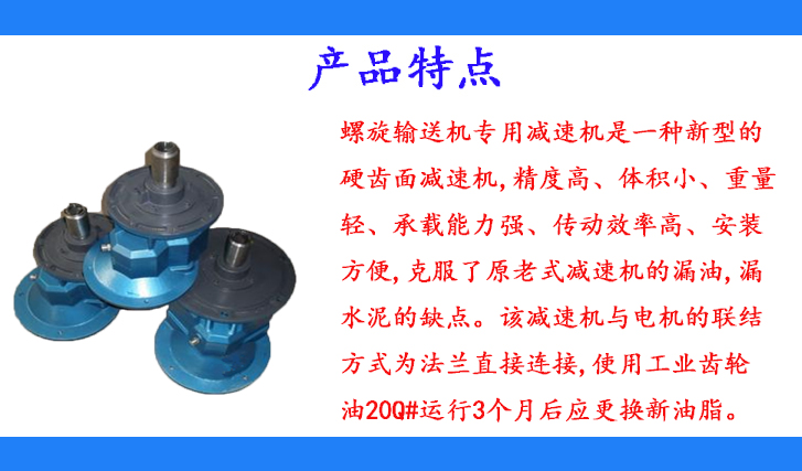 螺旋輸送機專用減速機是一種新型的硬齒面減速機,精度高、體積小、重量輕、承載能力強、傳動效率高、安裝方便,克服了原老式減速機的漏油,漏水泥的缺點。該減速機與電機的聯(lián)結(jié)方式為法蘭直接連接,使用工業(yè)齒輪油20Q#運行3個月后應(yīng)更換新油脂。