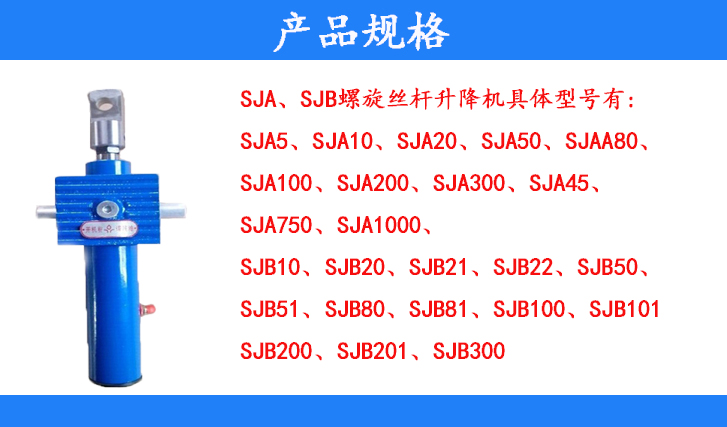 SJA、SJB螺旋絲桿升降機(jī)具體型號(hào)有:SJA5、SJA10、SJA20、SJA50、SJA80、SJA100、SJA200、SJA300、SJA450、SJA750、SJA1000