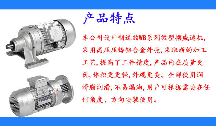 WB系列減速機具有傳動比大、效率高、體積小、質(zhì)量輕、經(jīng)久耐用、使用可靠、壽命長,可在任何角度任何方向安裝使用等特點。