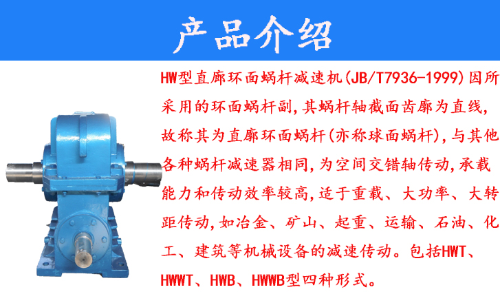 HW型直廊環(huán)面蝸桿減速機(jī)(JB/T7936-1999)因所采用的環(huán)面蝸桿副,其蝸桿軸截面齒廓為直線,故稱其為直廓環(huán)面蝸桿(亦稱球面蝸桿),與其他各種蝸桿減速器相同,為空間交錯(cuò)軸傳動(dòng),承載能力和傳動(dòng)效率較高,適用于重載、大功率、大轉(zhuǎn)距傳動(dòng),如冶金、礦山、起重、運(yùn)輸、石油、化工、建筑等機(jī)械設(shè)備的減速傳動(dòng)。包括HWT、HWWT、HWB、HWWB型四種形式。