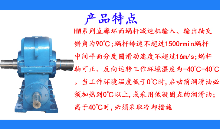 HW系列直廓環(huán)面蝸桿減速機(jī)輸入、輸出軸交錯(cuò)角為90℃;蝸桿轉(zhuǎn)速不超過1500rmin蝸桿中間平面分度圓滑動(dòng)速度不超過16m/s;蝸桿軸可正、反向運(yùn)轉(zhuǎn)工作環(huán)境溫度為-40℃-40℃。當(dāng)工作環(huán)境溫度低于0℃時(shí),啟動(dòng)前潤(rùn)滑油必須加熱到0℃以上,或采用低凝固點(diǎn)的潤(rùn)滑油;高于40℃時(shí),必須采取冷卻措施