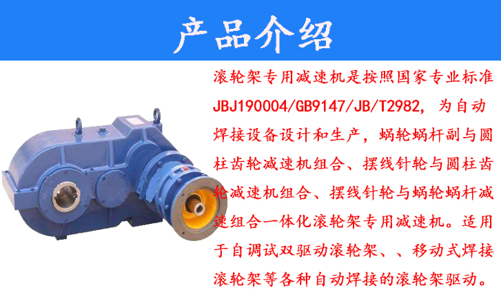 滾輪架專用減速機(jī)是按照國家專業(yè)標(biāo)準(zhǔn)JB19004/GB9147/JB/T2982,為自動焊接設(shè)備設(shè)計和生產(chǎn)的,蝸輪蝸桿副與圓柱齒輪減速機(jī)組合、擺線針輪與圓柱齒輪減速機(jī)組合,擺線針輪與蝸輪蝸桿減速組合一體化滾輪架專用減速機(jī)。適用于自調(diào)式雙驅(qū)動滾輪架、移動式焊接滾輪架等各種自動焊接的滾輪架驅(qū)動。