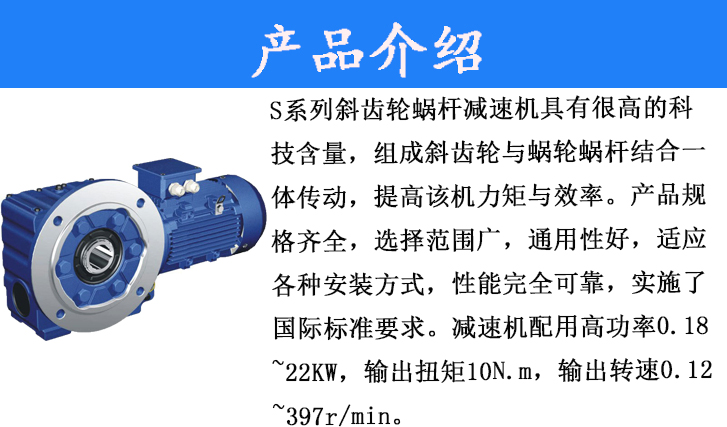 S系列齒輪蝸桿減速電機具有很高的科技含量,有斜齒輪與蝸輪蝸桿結(jié)合一體傳動,提高該機力矩與效率。該系列產(chǎn)品規(guī)格齊全,轉(zhuǎn)速范圍廣,通用性好,適應(yīng)各種安裝方式,性能安全可靠壽命長,實施了國際標準要求。減速機配用高功率0.18~22KW,輸出轉(zhuǎn)距10N.m~4890N.m,輸出轉(zhuǎn)速.12~397r/mino