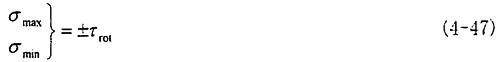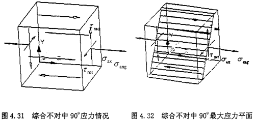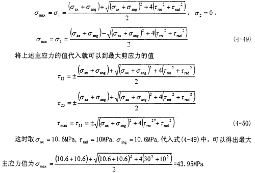 此時的應(yīng)力情況屬于三向應(yīng)力狀態(tài),所以其分析過程和徑向不對中90°以及270°以情況相似,只是這里還有了附加的軸向拉應(yīng)力和附加的角向應(yīng)力,將各個應(yīng)力值σxx=σax+σang,σyy=0,σzz=0,τxy=τrot,τyz=0,τzx=τrad分別代入式(4-29)(4-30)(4-31)中,可以得到