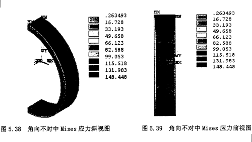 2.顯示節(jié)點(diǎn)的Von Mises應(yīng)力云圖:選擇Main Menu>General Postproc>Plot Result>NodalSolu,在彈出的對(duì)話框內(nèi)選擇“Stress”,第二欄內(nèi)選擇“Von Mises Stress”,則其顯示的云圖如圖5,38,5.39所示