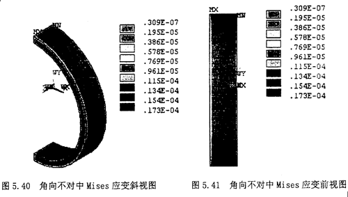3.顯示節(jié)點(diǎn)的Von Mises應(yīng)變?cè)茍D:選擇Main Menu>General Postproc>Plot Result>NodalSolu,在彈出的對(duì)話框內(nèi)選擇“Strain”,第二欄內(nèi)選擇“Von Mises Strain”,則其顯示的云圖如圖5.40,5.41所示