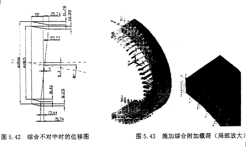 重復(fù)5.4.2節(jié)中的(1),(2),(3),(4),(5),(6)步驟。然后開始施加綜合的附加載荷。由于綜合位移使得橡膠圓環(huán)附加的徑向拉應(yīng)力σax,附加的剪應(yīng)力τrad,附加的角向應(yīng)力τrad,以及由橡膠圓環(huán)旋轉(zhuǎn)扭矩產(chǎn)生的剪應(yīng)力τrot。所以綜合不對(duì)中的應(yīng)力情況應(yīng)該是σax、τrad、τrad與τrot的疊加。施加綜合附加載荷后的圖形圖5.43所示。