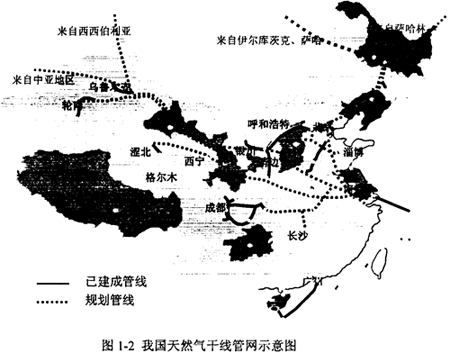 我國十至十五年內(nèi)天然氣管網(wǎng)建設(shè)的總體規(guī)劃可以概括為“兩橫兩縱”:“兩橫”分別指立足于國內(nèi)資源的輪南~上海西氣東輸干線,以及為從西部其他國家引進天然氣建設(shè)的第二條新疆~上海輸氣干線:“兩縱”是指從俄羅斯進口天然氣,分別建設(shè)東西伯利亞經(jīng)東北至北京,以及薩哈林至沈陽輸氣干線,具體線路走向如圖1-2所示。