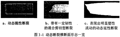 圖3-2顯示了DBF和DDF的形貌特征。從圖中看出動(dòng)態(tài)延性斷裂相比于脆性斷裂具有速度較低,裂紋擴(kuò)展途徑比較單一,能自行止裂等特點(diǎn)。由于脆性斷裂已被廣泛遏止,近二十年來,人們把注意力主要集中在延性斷裂的起裂擴(kuò)展和止裂上,對(duì)延性斷裂的關(guān)注遠(yuǎn)超過對(duì)脆性斷裂的研究,目前還遠(yuǎn)未結(jié)束。管線鋼動(dòng)態(tài)斷裂韌性的測(cè)定也就成為了人們關(guān)注的焦點(diǎn)。